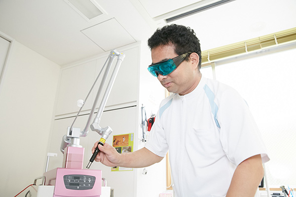 レーザーを数分程度照射します。必要に応じて表面麻酔を施しますが、軽く輪ゴムではじかれるようなチクチクする程度の痛みです。